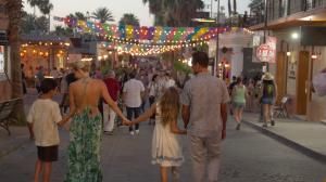 Families enjoying an evening stroll through the lively streets of San José del Cabo.
