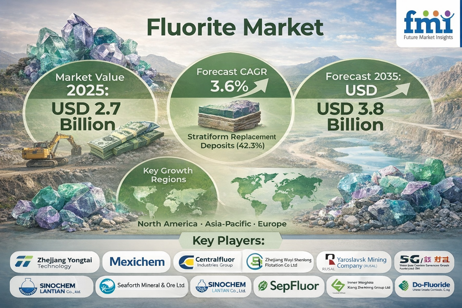 NEWARK, DE, UNITED STATES, March 27, 2026 /EINPresswire.com/ -- The global fluorite market is estimated to be valued at USD 2.7 billion in 2025 and is projected to reach USD 3.8 billion by 2035, registering a CAGR of 3.6% during the forecast period. Growth is driven by increasing demand from metallurgical, chemical, and manufacturing industries, along with expanding industrial infrastructure worldwide.